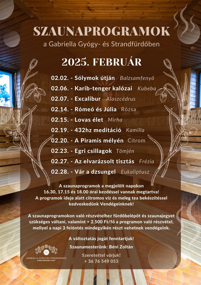 Februárban is különleges szaunaprogramokkal várjuk, hogy testileg és lelkileg is megújulhasson. Illatos felöntések, relaxáló hangulat és szakértő szaunamesterünk gondoskodik a tökéletes élményről.