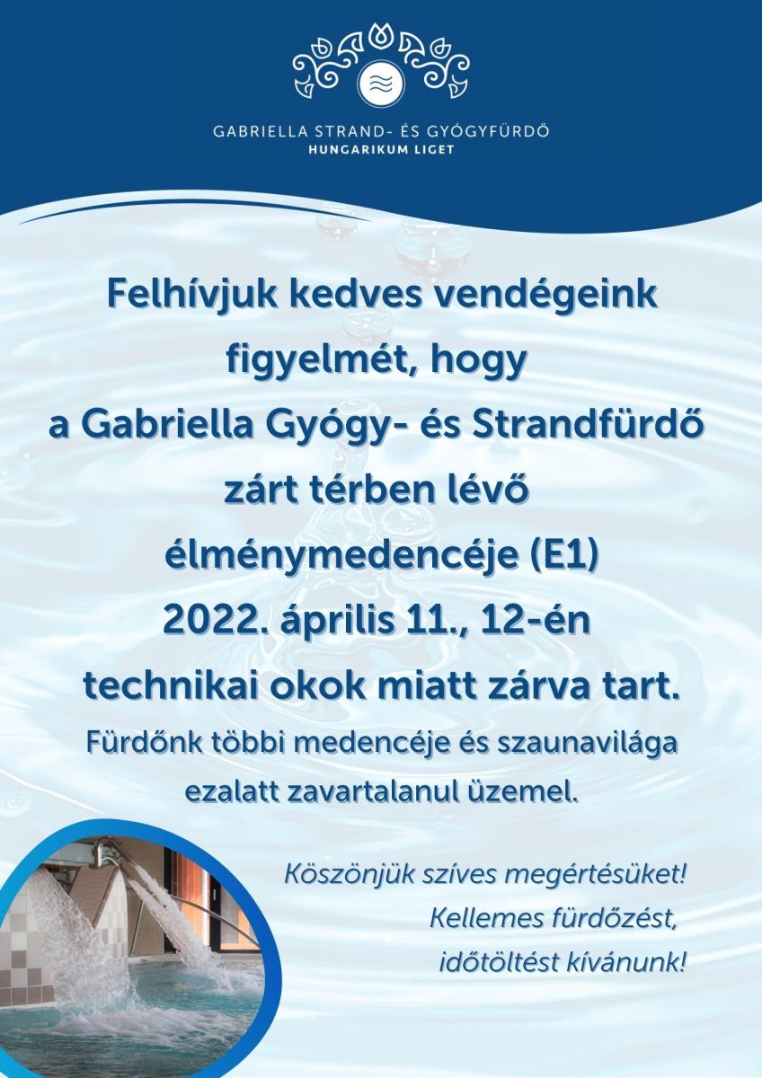 Felhívjuk kedves Vendégeink figyelmét, hogy a Gabriella Gyógy- és Strandfürdő zárt térben lévő élménymedencéje (E1) 2022. április 11., 12-én technikai okok miatt zárva tart.