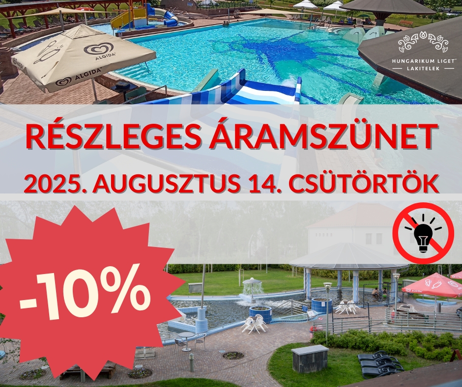2025. augusztus 14-én, csütörtökön részleges áramszünet miatt szolgáltatásainkat csak korlátozott formában tudjuk nyújtani. A nagy energiaigényű berendezések (élménymedencék elemei, vízsugár-masszírozók, csúszdák, szaunavilág) 16 óráig, valamint a Gabriella Látványkonyha a nap teljes egészében nem fog üzemelni!