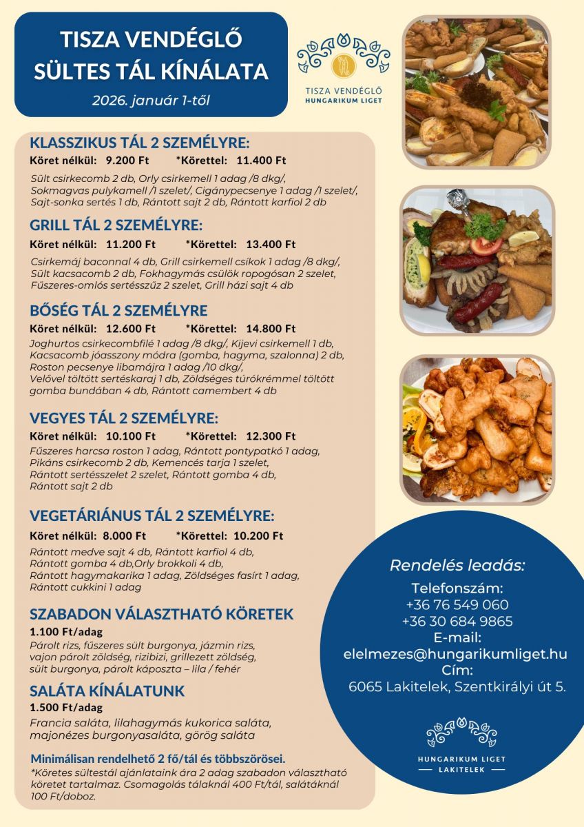 Családi összejövetelekre, születésnapokra, névnapi ebédre, bármilyen rendezvényre, a Tisza Vendéglő sültes tál kínálata továbbra is előrendelhető.