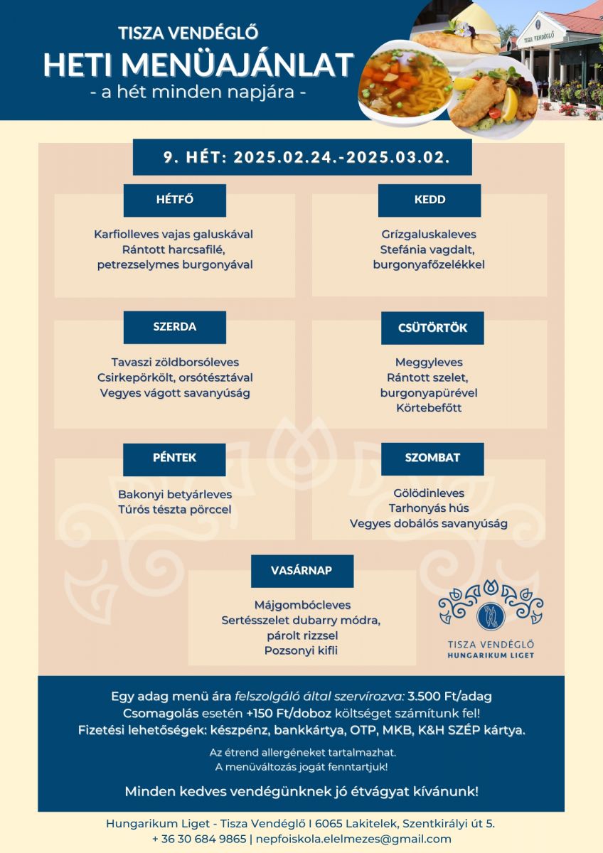 Tisza Vendéglő heti menü ajánlata 2025.02.24.-2025.03.02.