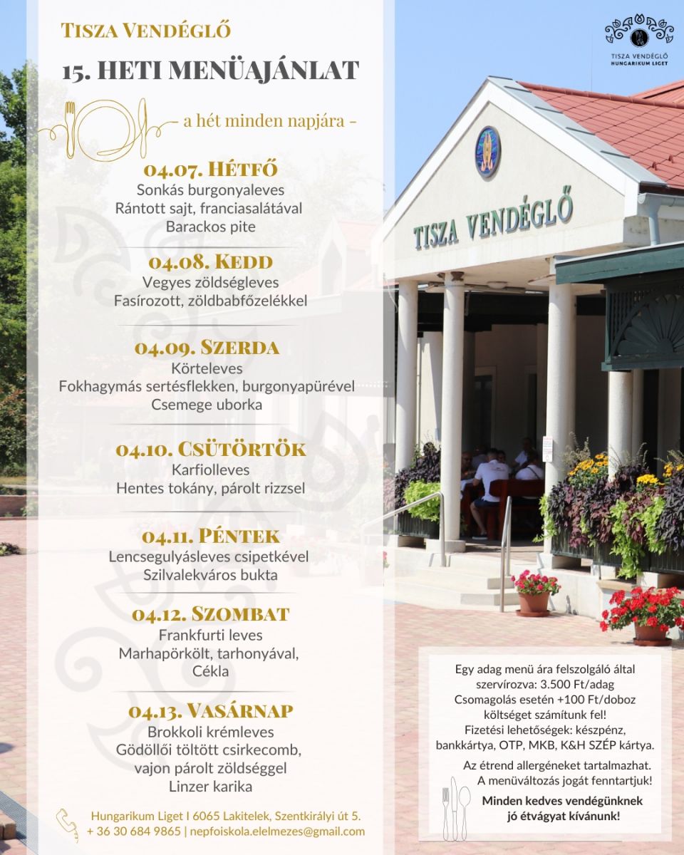 Tisza Vendéglő heti menü ajánlata 2025.04.07.-2025.04.13.