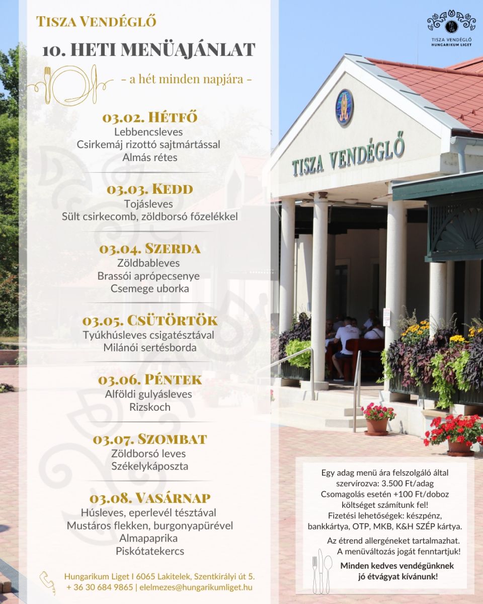 Tisza Vendéglő heti menü ajánlata 2026.03.02.-2026.03.08.