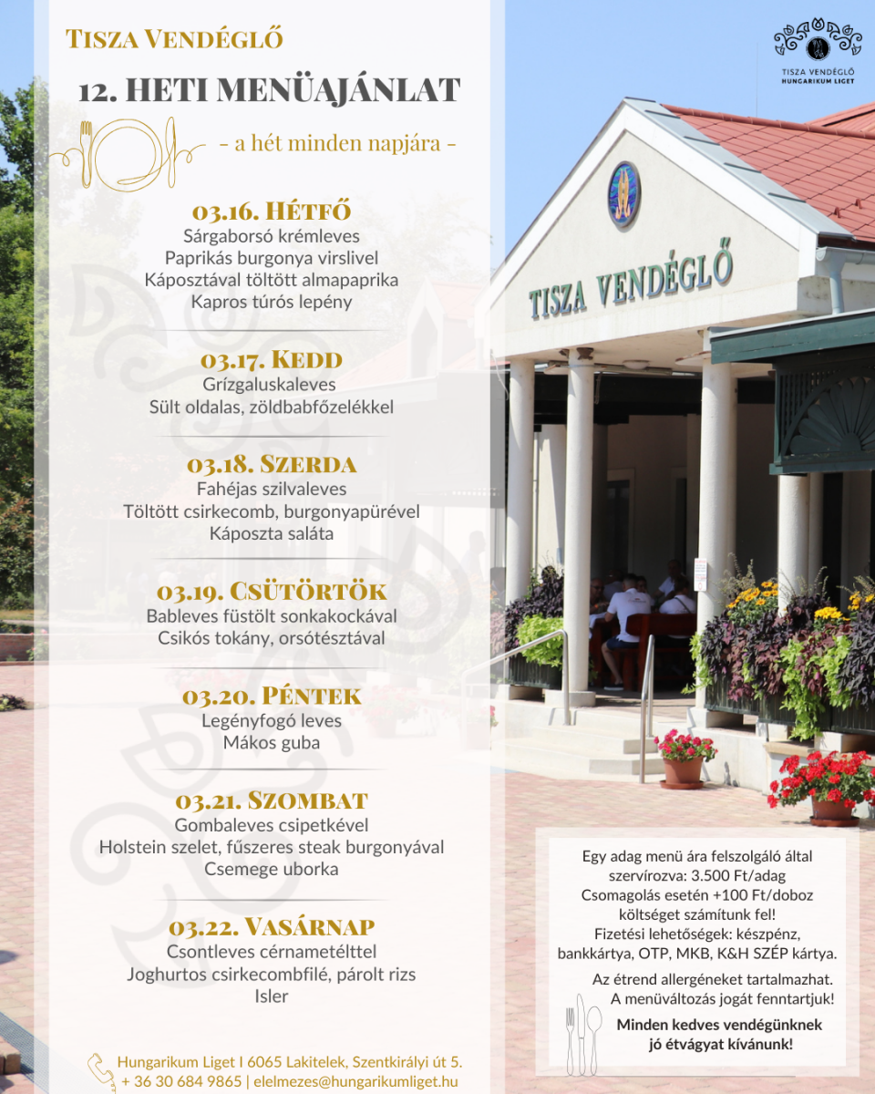 Tisza Vendéglő heti menü ajánlata 2026.03.16.-2026.03.22.