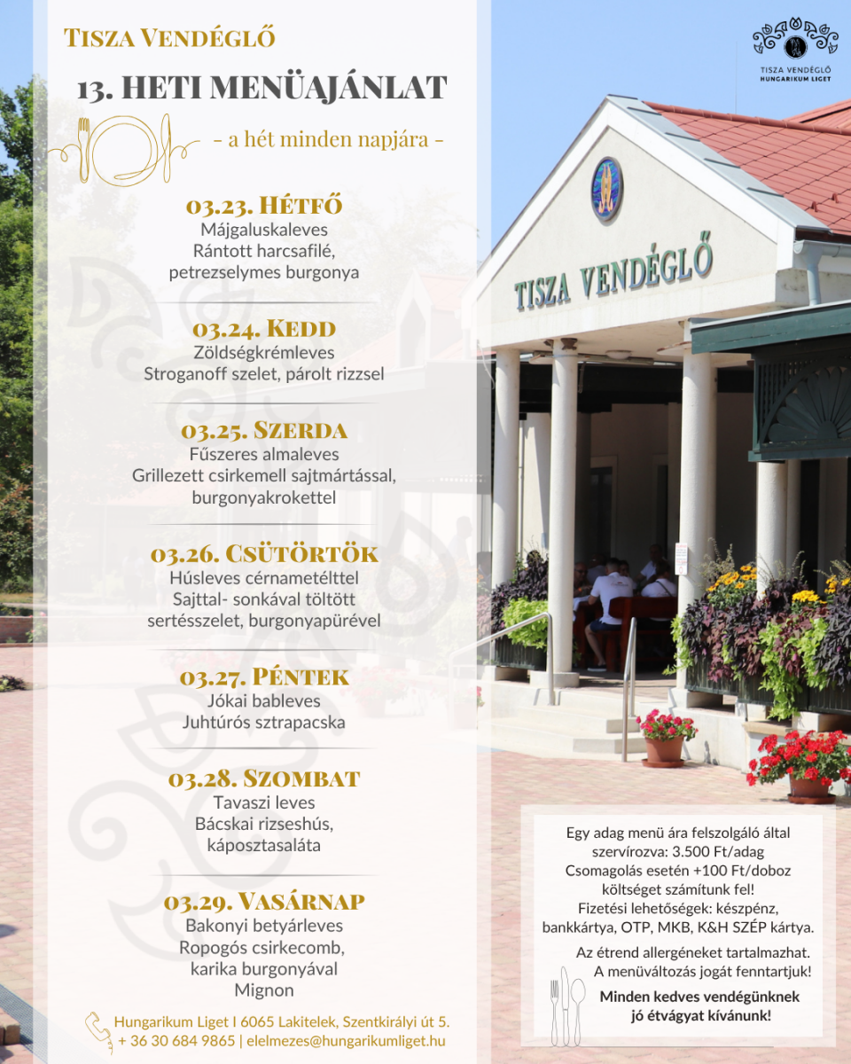Tisza Vendéglő heti menü ajánlata 2026.03.23.-2026.03.29.