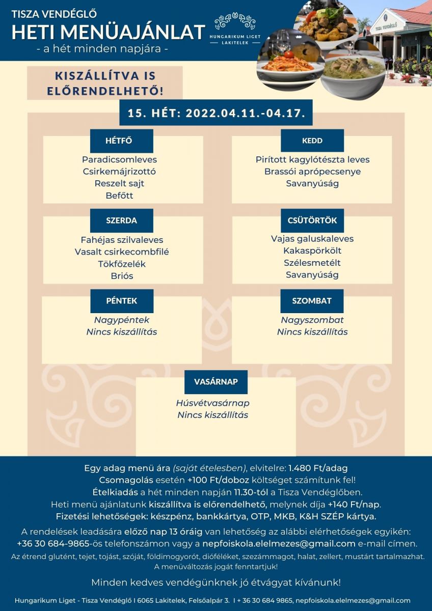 Ételkiadás: a hét minden napján 11.30-tól a Tisza Vendéglőben.