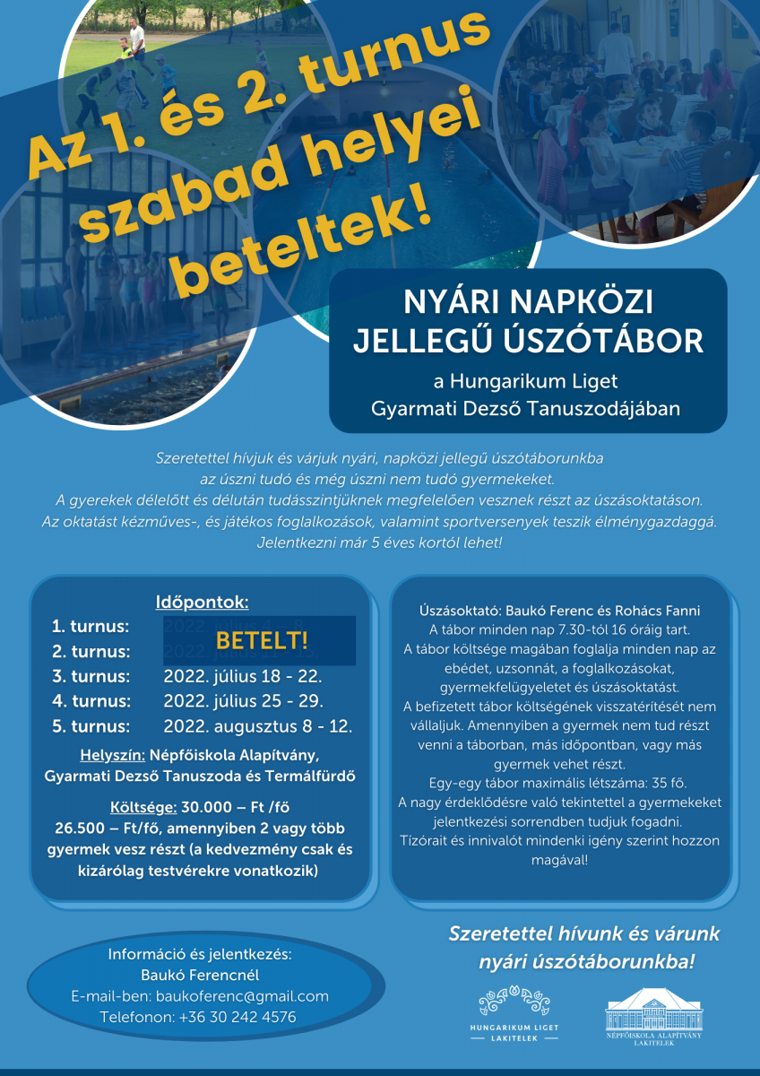 ÚSZÓTÁBORUNK ELSŐ KÉT TURNUSÁRA MÁR NEM TUDUNK JELENTKEZŐKET FOGADNI, SZABAD HELYEINK BETELTEK!
