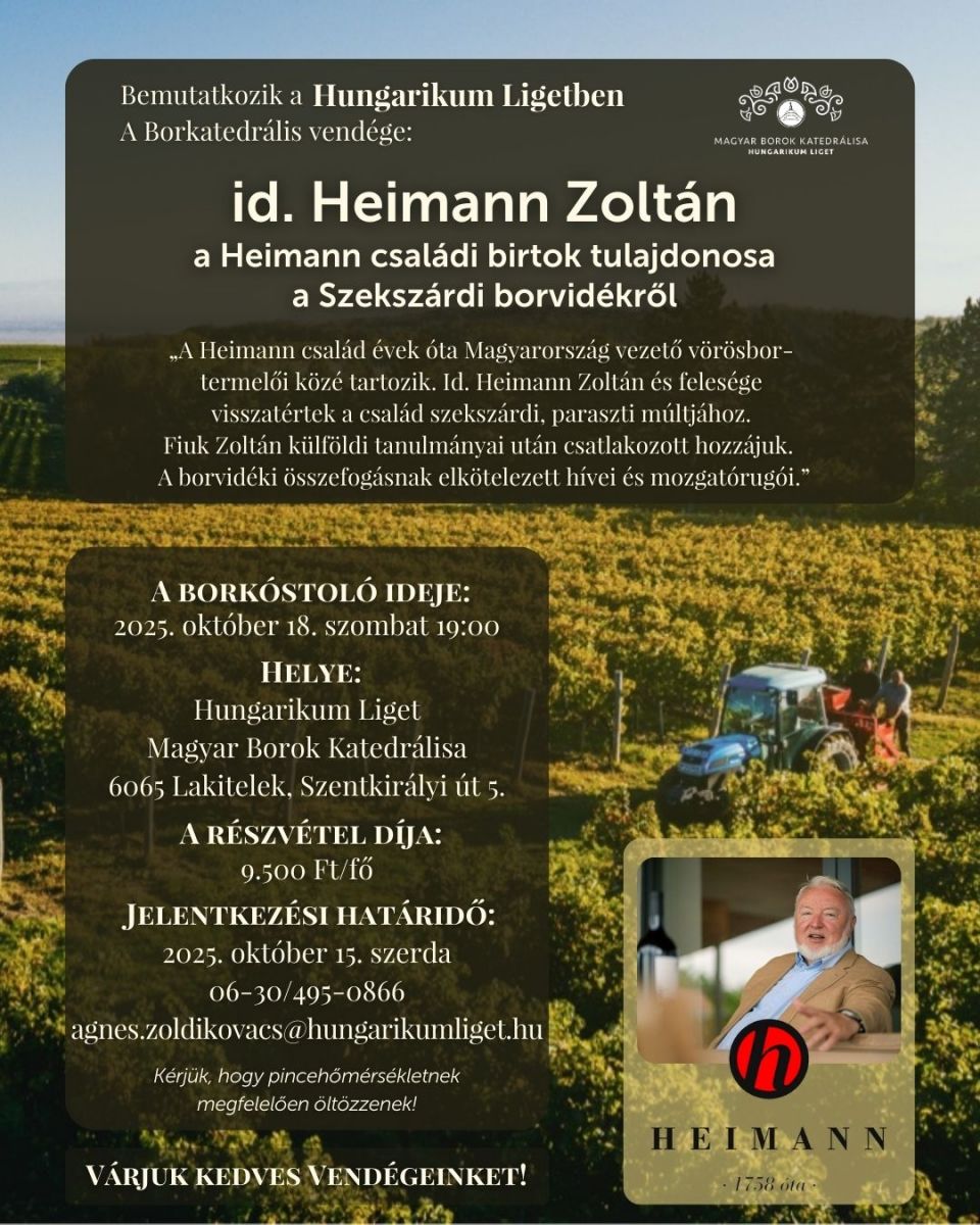 Október 18-án a szekszárdi borvidék legendás alakja, id. Heimann Zoltán látogat el a Magyar Borok Katedrálisába, hogy személyesen vezesse végig vendégeinket a Heimann Pincészet válogatott tételein.