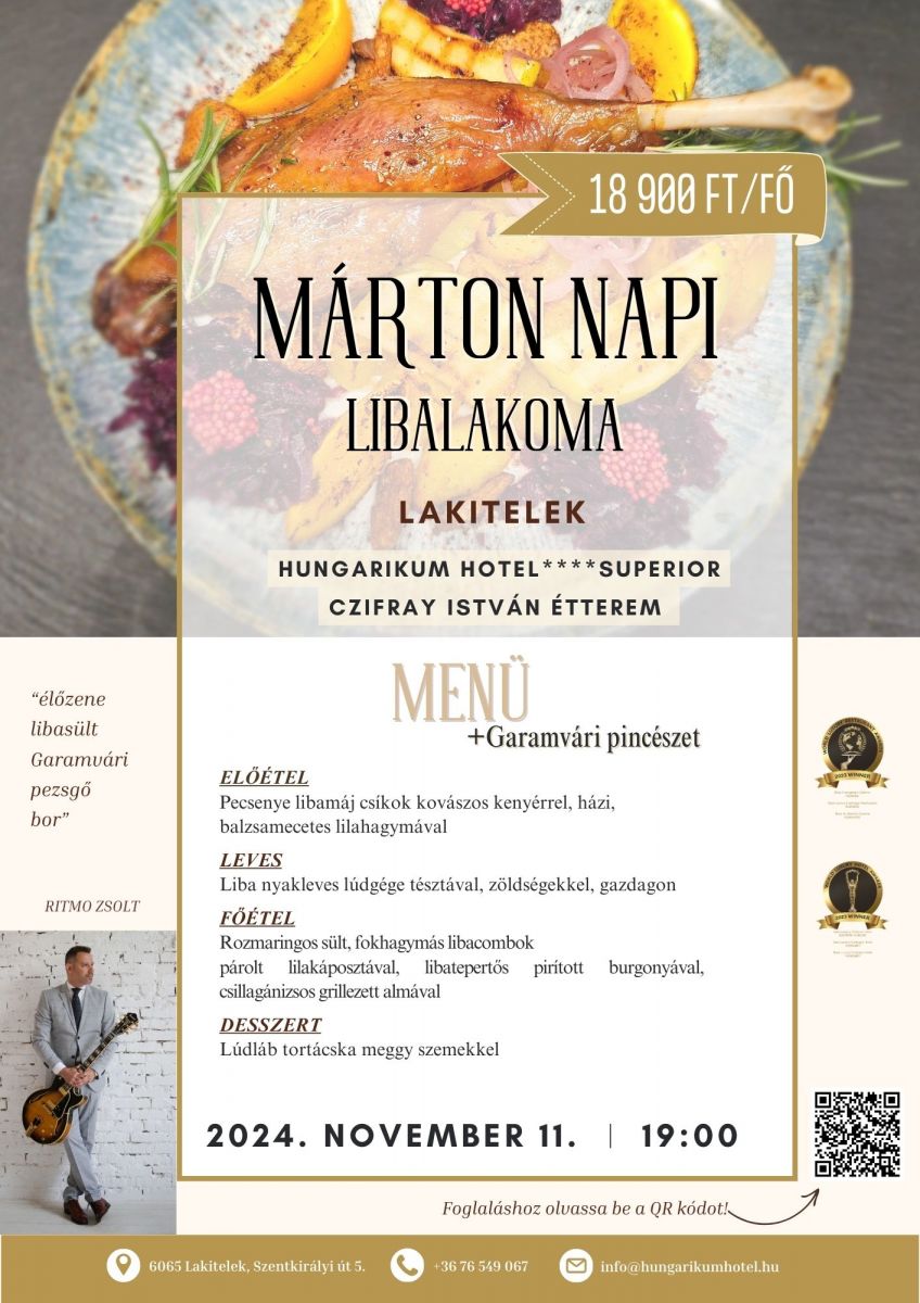 Márton-napi libalakománkon való részvételhez előzetes asztalfoglalás szükséges, melyet a +36 76 549 067 telefonszámon vagy az info@hungarikumhotel.hu e-mail címen tudnak megtenni. Az esemény ára 18 900 Ft/fő. SZÉP kártyát is elfogadunk!