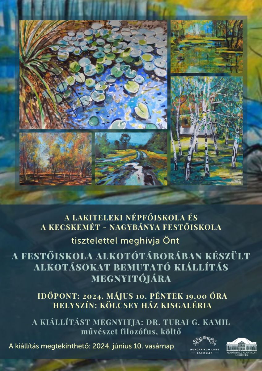 A lakiteleki Népfőiskola és a Kecskemét-Nagybánya Festőiskola tisztelettel meghívja Önt A festőiskola alkotótáborában készült alkotásokat bemutató kiállítás megnyitójára 2024. május 10-én a lakiteleki Hungarikum Liget Kölcsey Házának kisgalériájába.