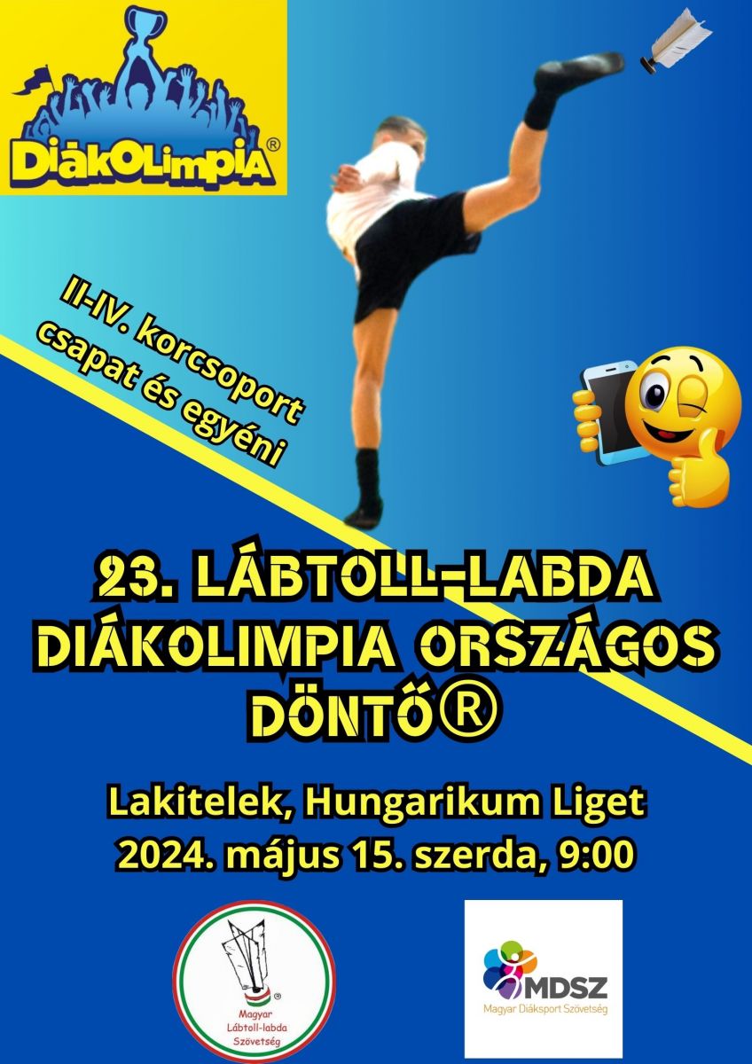 Szeretettel hívjuk Önöket Lakitelekre, a Hungarikum Ligetbe megrendezésre kerülő 23. Lábtoll-labda Diákolimpia országos döntőjére, mely május 15-én, szerdán 9 órai kezdettel kerül megrendezésre, a Kárpátia Rendezvényházban.