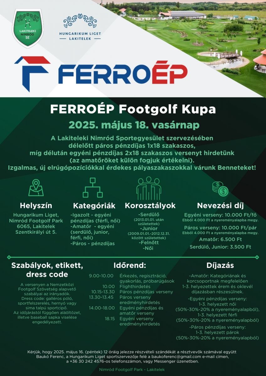 Szeretettel várjuk az igazolt, amatőr, junior valamint a serdülő korcsoportú versenyzőket is május 18-ai FERROÉP Footgolf Kupánkra!