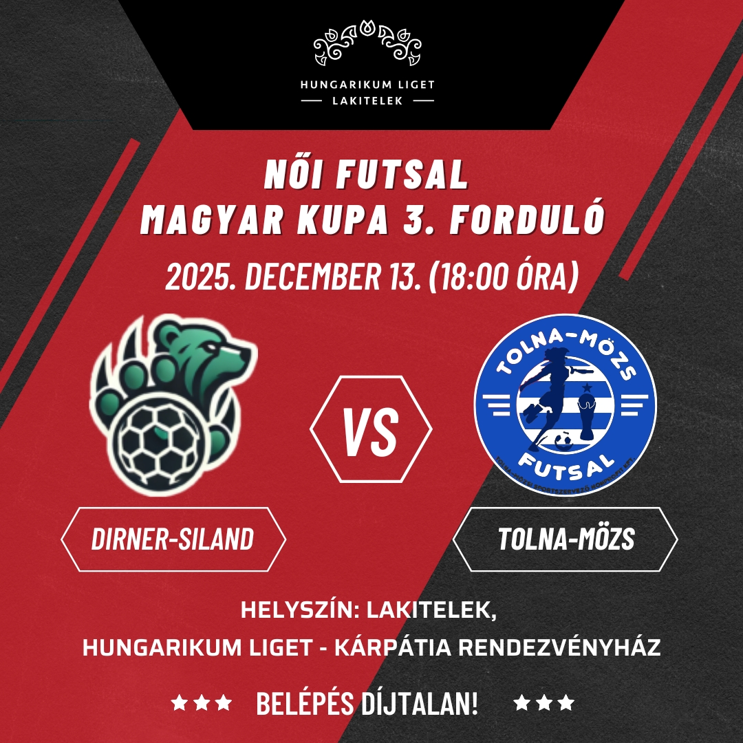 Szeretettel várunk minden sportbarátot 2025. december 13-án (szombat) 18:00 órai kezdéssel, a Dirner-Siland Vs. Tolna MÖZS futsal csapatok mérkőzésére.
