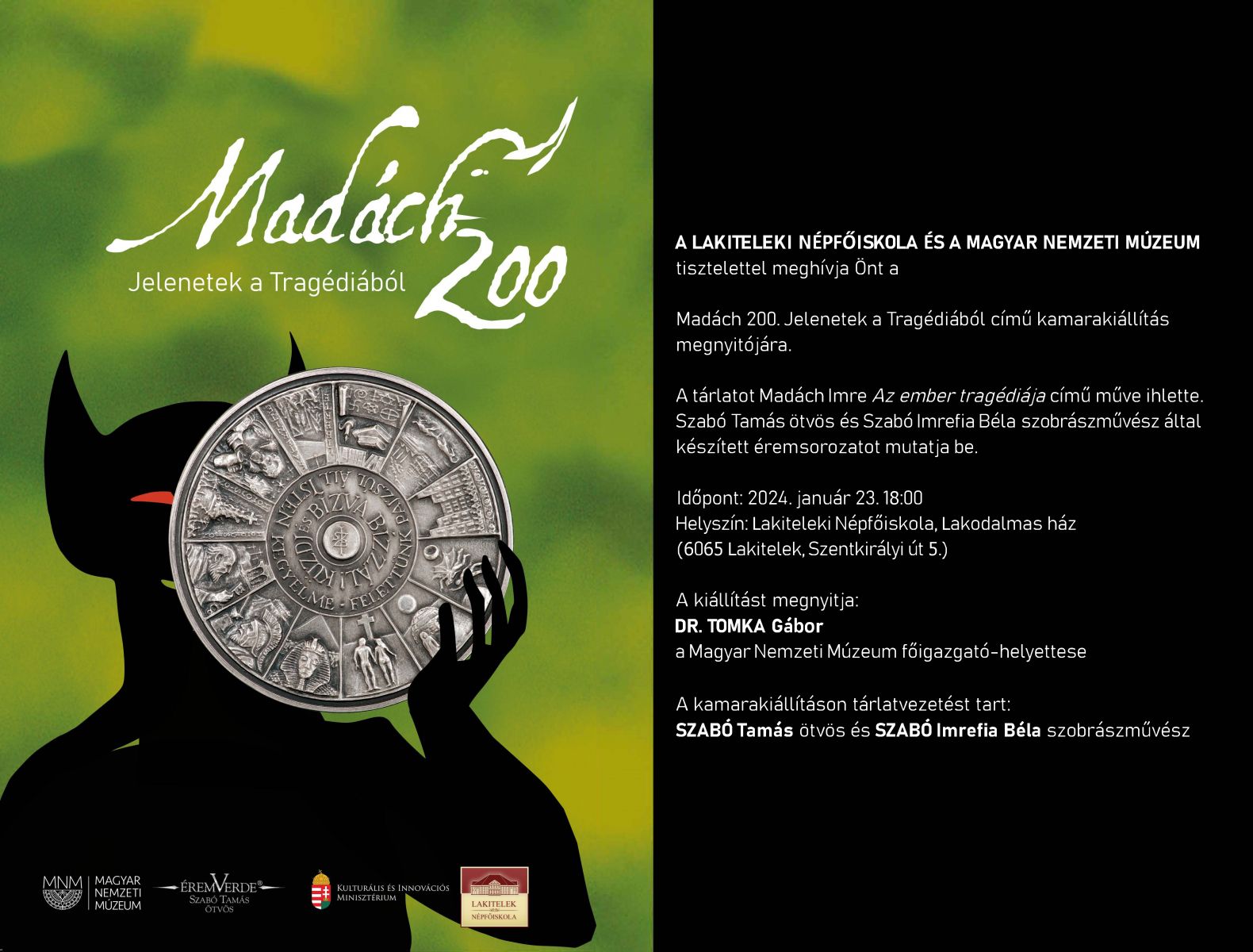 A Lakiteleki Népfőiskola és a Magyar Nemzeti Múzeum tisztelettel meghívja Önt a Madách 200. Jelenetek a Tragédiából című kamarakiállítás megnyitójára.