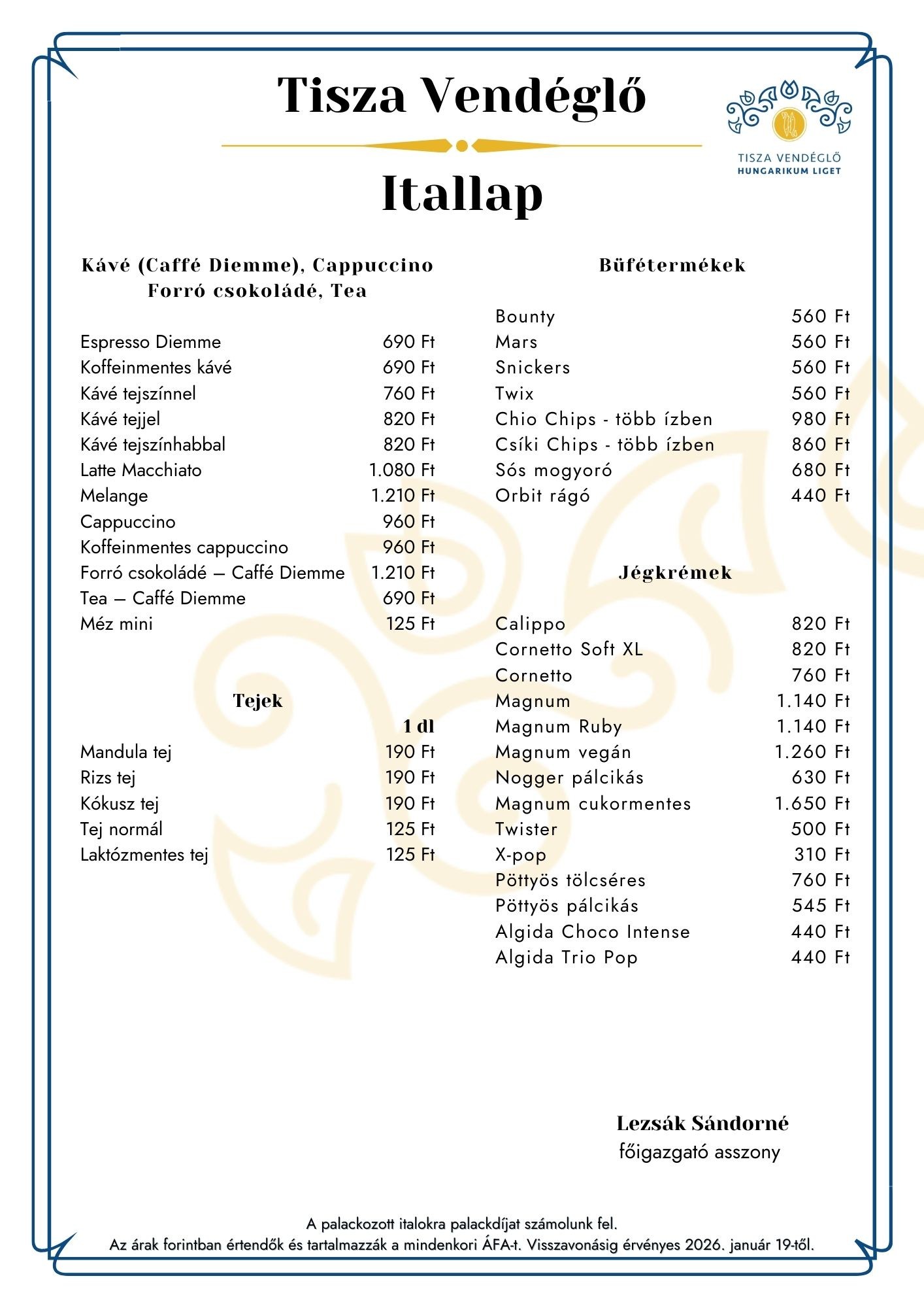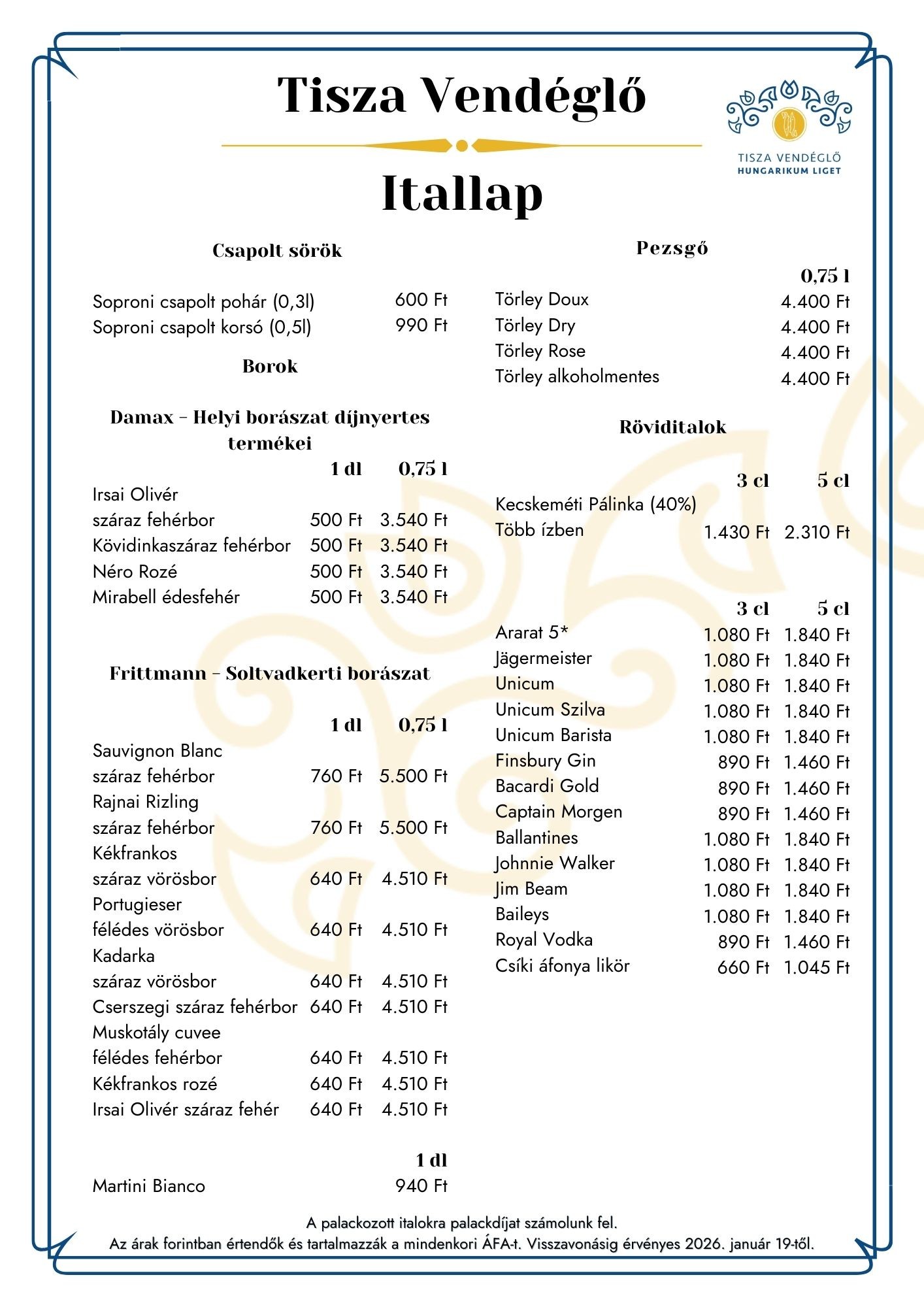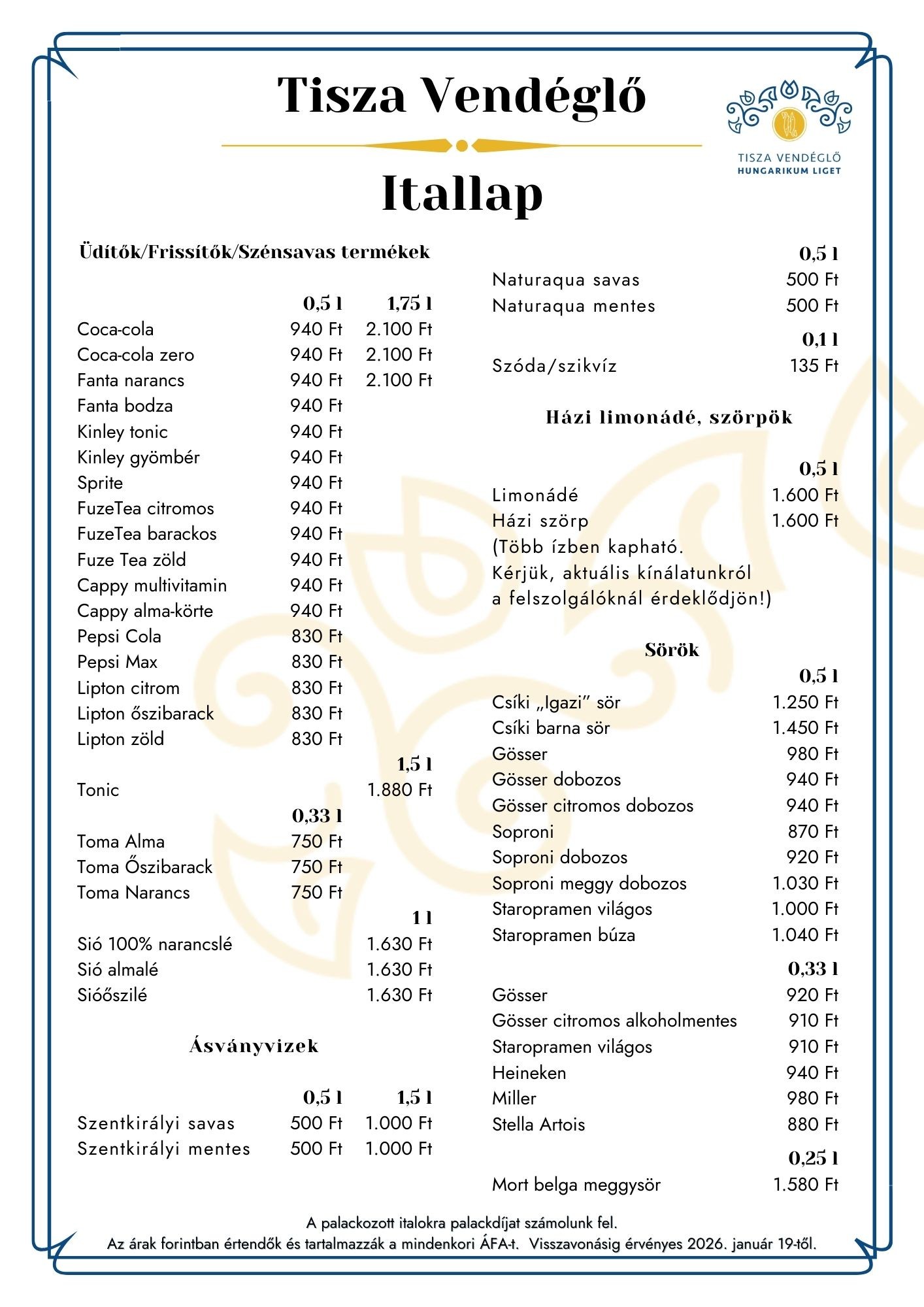 Tisza Vendéglőnk hetente frissülő, magyaros ízvilágot kínáló változatos menükínálattal készül! Aktuális menüajánlataink elvitelre előrendelhetőek!